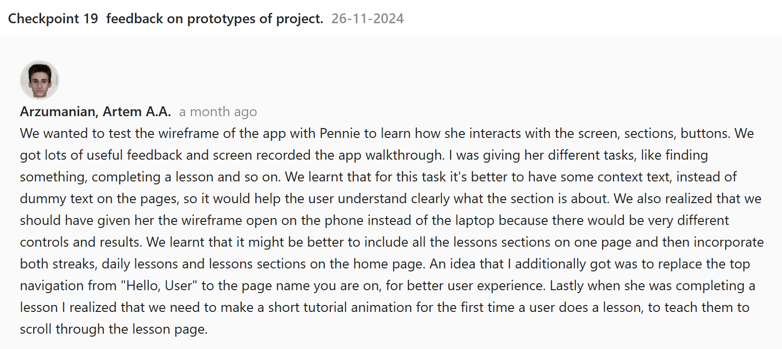 As the result of my and my teammates’ tests I have combined all of our notes to create a simple chart that contained feedback: On the sections/elements that should be moved somewhere else; Things to add to pages; Errors that were found or if something was unclear; Things that well made. This feedback chart would help me well in the iterative process of the app’s design.
