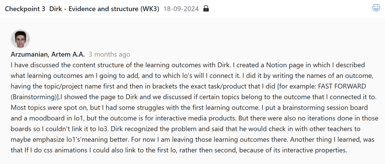 It also proved to be an effective sheet to ask feedback for. I wanted to make sure that the outcomes that I have written fit the right lo, so I asked Dirk for his opinion. He gave me a few suggestions and also questioned the outcomes that I put in lo1, but after explaining that I put those as media products that I created, not interactive ones, it seemed like the outcomes could have a place in there. That Notion file also became useful in marking which outcomes I have already written down, so I always know what is left to do.
